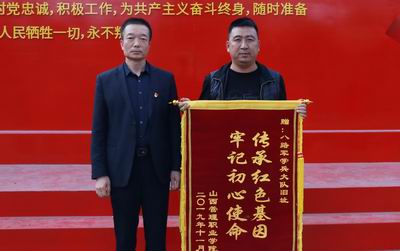 参观前,举行了简短的仪式。仪式上,院纪委书记李强向八路军学兵大队旧址赠送锦旗。院党委委员、副院长丁建业带领全体党员面对鲜红党旗,举起右拳庄严宣誓,以铿锵誓言表达对党的无限热爱与忠诚。