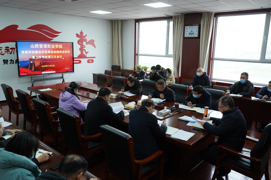 11月30日下午,山西管理职业学院全面建设清廉学校示范单位创建活动动员会暨工作专班第三次会议在崇德楼1210会议室召开。党委书记韦阳出席,院党委委员、全面建设清廉学校工作专班全体成员、各党支部书记及各部门负责人参加。会议由院长王爱国主持。