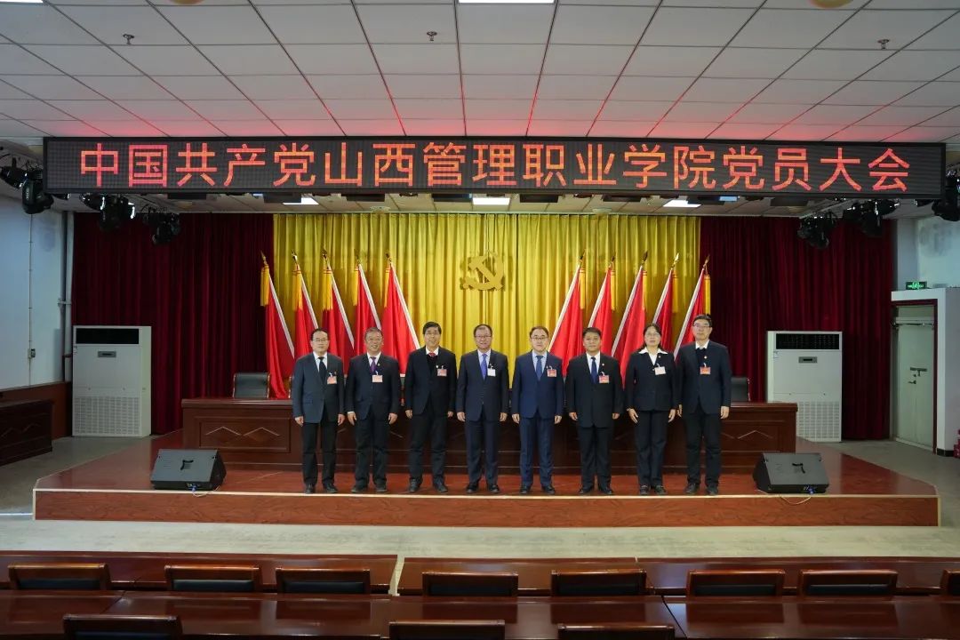 设在崇德楼报告厅的大会会场庄严隆重。主席台正上方显示着“中国共产党山西管理职业学院党员大会”会标,10面鲜艳的红旗簇拥着由镰刀和铁锤组成的党徽。