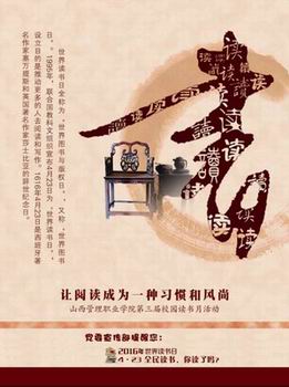据悉,活动将围绕“让阅读成为一种习惯和风尚”主题,陆续开展推荐阅读书目、撰写读书心得、评选“大学生阅读之星”、大学生阅读情况调查、“爱阅读·书梦想”征文比赛、书签设计赛、经典美文诵读、教工读书主题演讲、经典有声阅读等活动,内容丰富,形式多样,参与性、针对性强,让师生共享一场场精神盛宴,共同打造书香馥郁、清新高雅的校园文化。