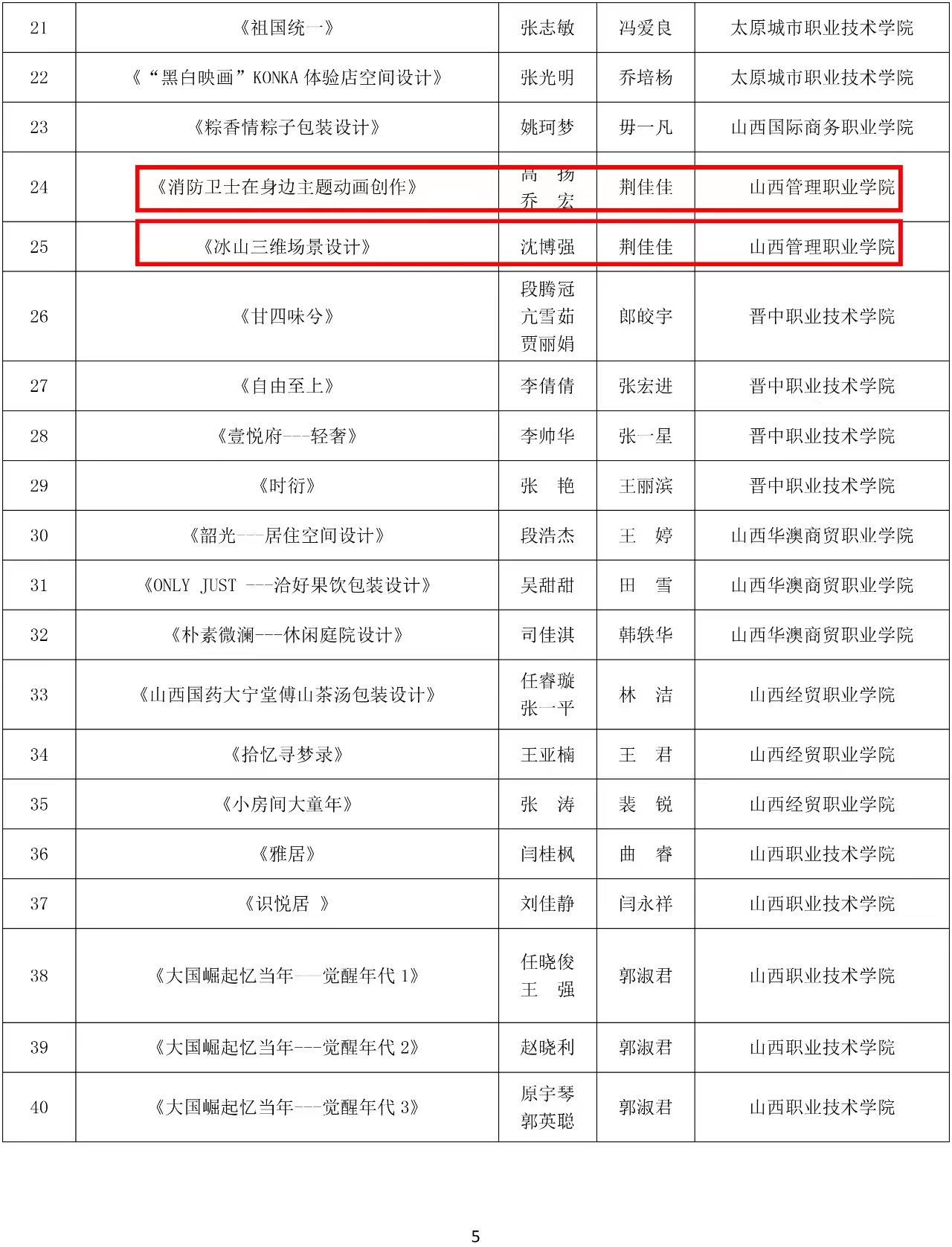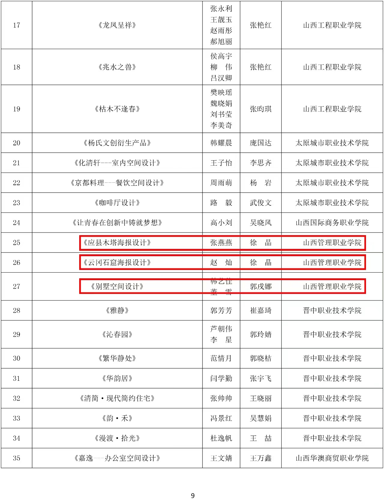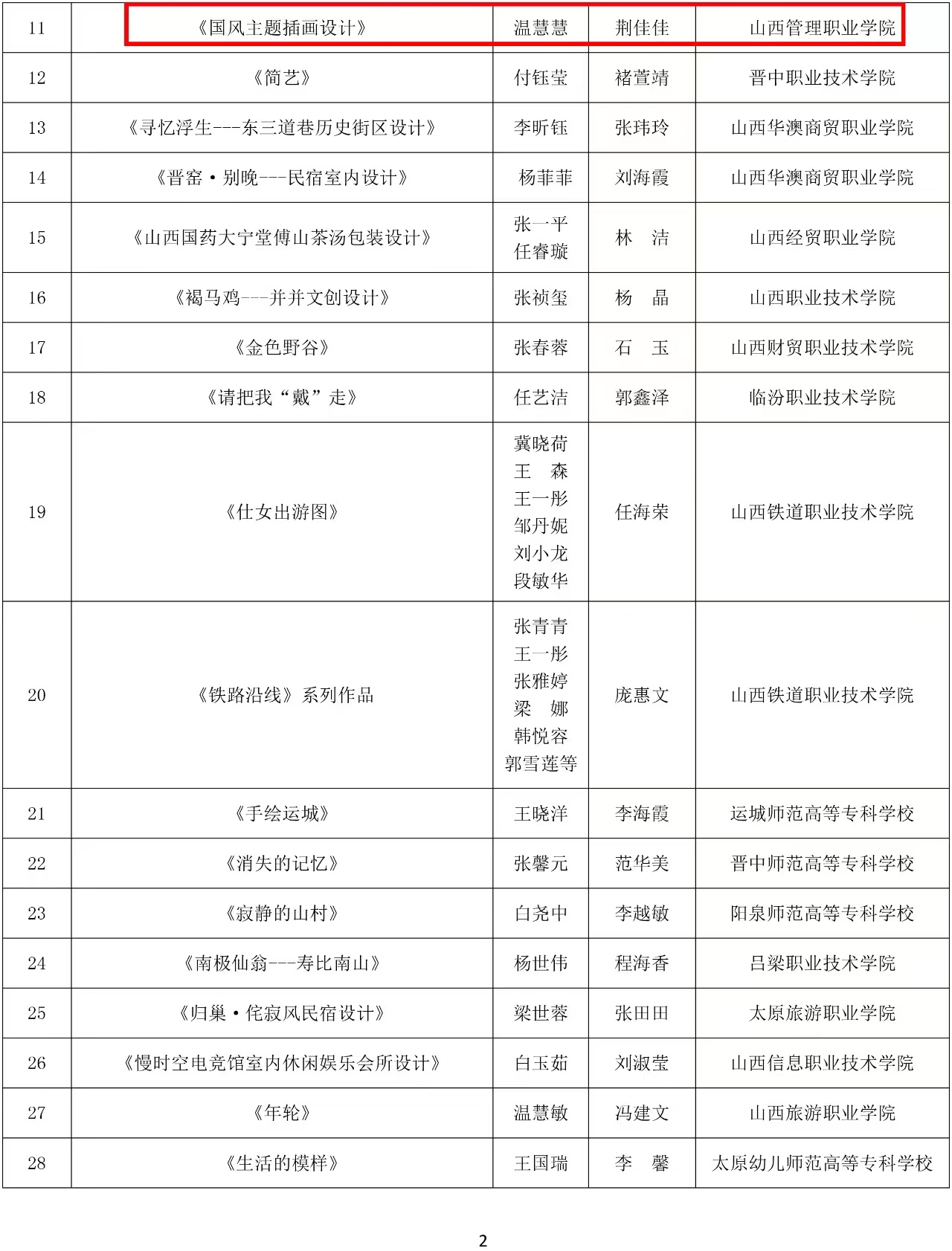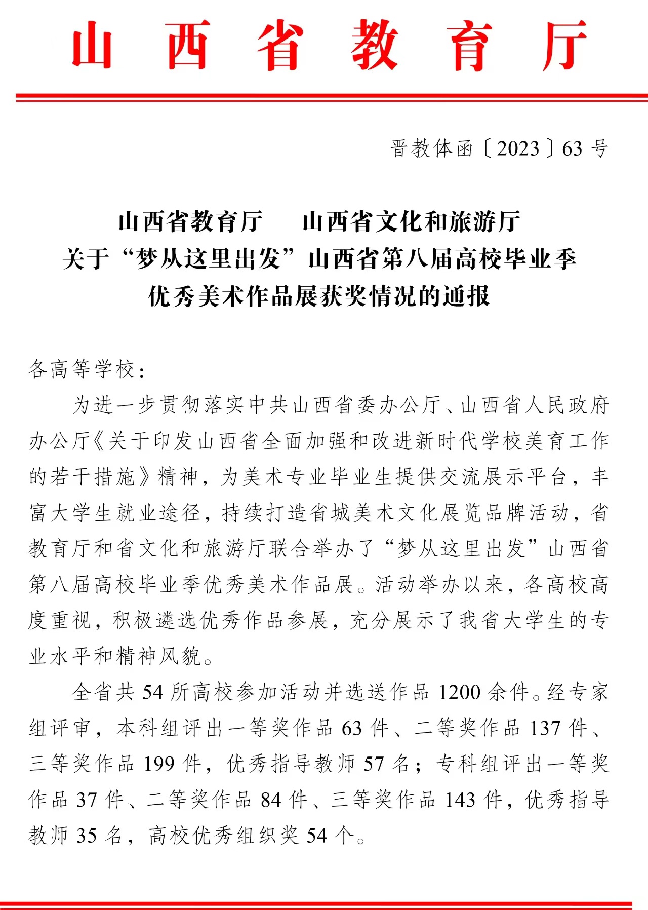 根据晋教体函〔2023〕63号文件通报,我院艺术系学生在山西省第八届高校毕业季优秀美术作品展中,荣获设计类作品一等奖1项,二等奖2项,三等奖3项,学院获得优秀组织奖。