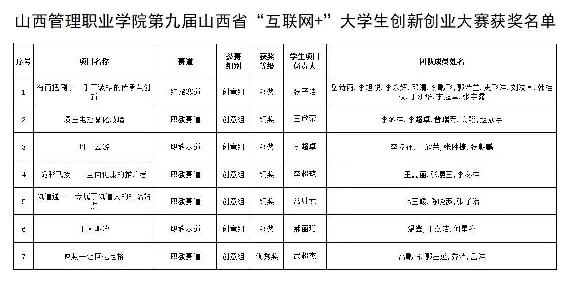 9月6日,由山西省教育厅主办、山西大学承办的山西省第九届“互联网+”大学生创新创业大赛主体赛事落下帷幕。我院在省赛中获得职教赛道5铜奖和1优秀奖,青年红色筑梦之旅赛道1铜奖的优秀成绩,这是我院在该赛事中又一突破。