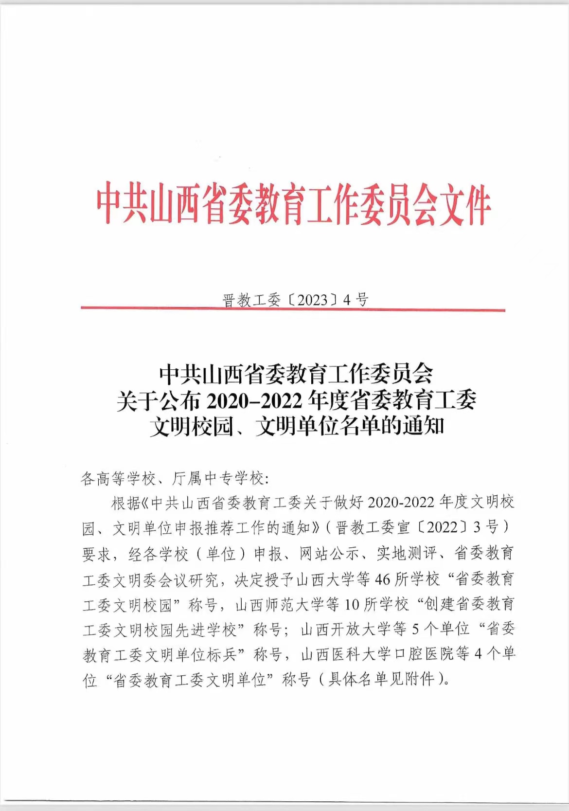 近日,中共山西省委教育工作委员会公布了“2020—2022年度省委教育工委文明校园、文明单位” 名单,我院被授予“省委教育工委文明校园”称号。