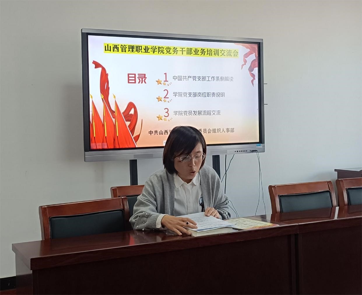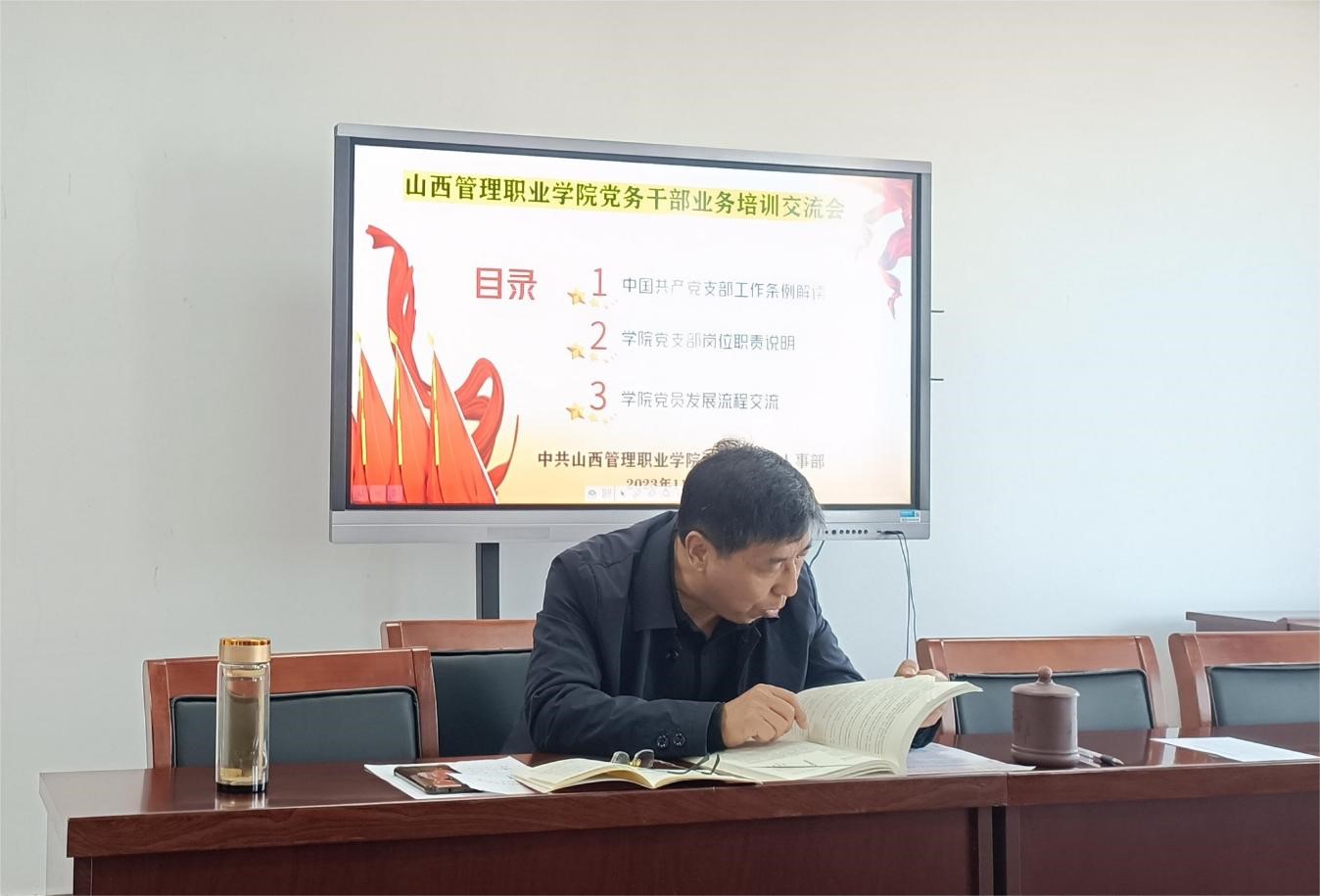 11月1日,山西管理职业学院党务干部业务培训交流会在崇德楼1206室(党校)召开,学院党委副书记丁建业主持会议,各党支部书记、系组织员参加。会上,丁建业同志深入解读了《中国共产党支部工作条例(试行)》,组织人事部负责党员发展的顾鑫鑫同志对照中国共产党发展党员流程为大家进行了专题讲授。