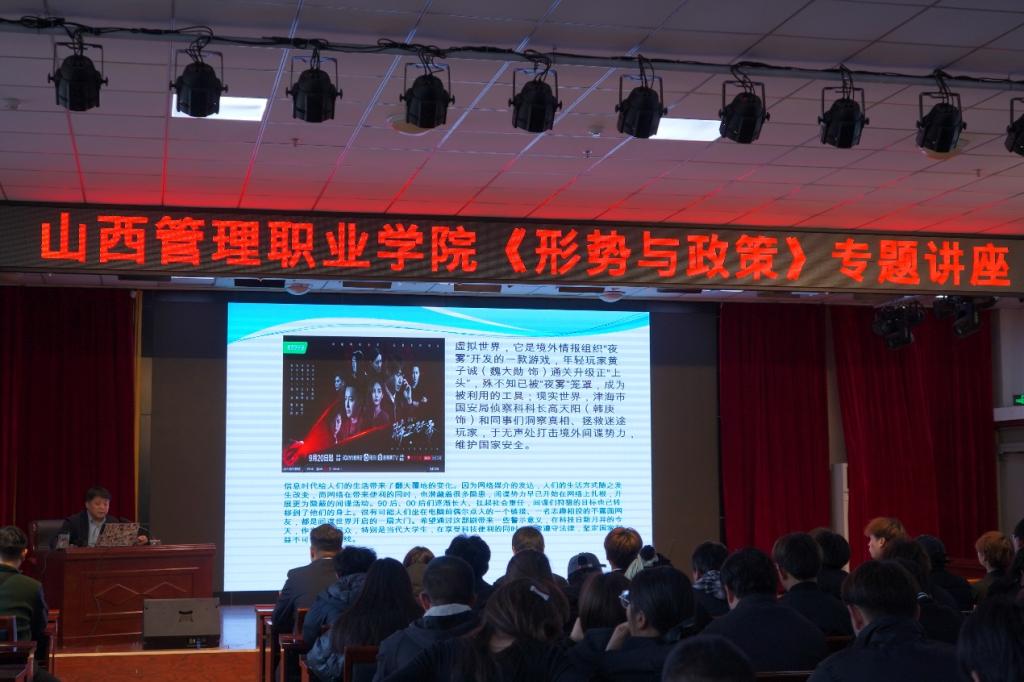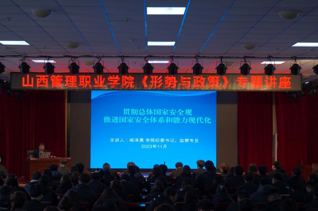 11月14日下午,院党委委员、纪委书记阎泽勇,在崇德楼三楼报告厅为文化艺术系学生作《形势与政策》讲座。讲授的题目是《贯彻总体国家安全观推进国家安全体系和能力现代化》。