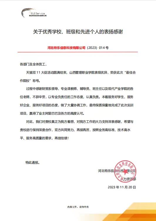 近日,山西管理职业学院收到来自河北特乐信息科技有限公司的表扬信,对我院在“天猫双11大促活动”中的表现表示肯定,授我院“最佳合作院校”称号,对我院领导、教师在活动中的高度关切和鼎力支持表示衷心的感谢,并希望今后与我院保持深度合作,再创佳绩。