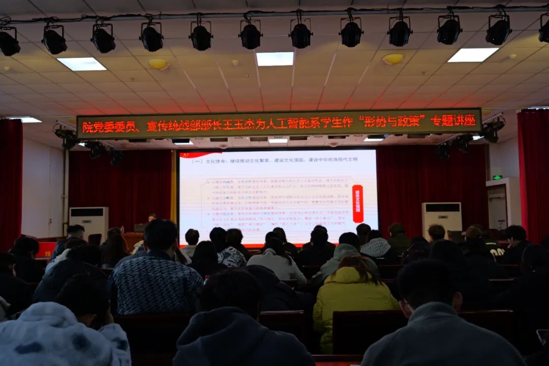 为全面贯彻落实党的二十大精神和《教育部关于加强新时代高校形势与政策课建设的若干意见》等文件精神,12月12日下午,院党委委员宣传部部长王玉杰以《深入学习领会习近平文化思想 更好担负新的文化使命》为题,为人工智能技术系全体学生讲授了一堂内容丰富、精彩生动的“形势与政策”课。思政部全体教师参加。