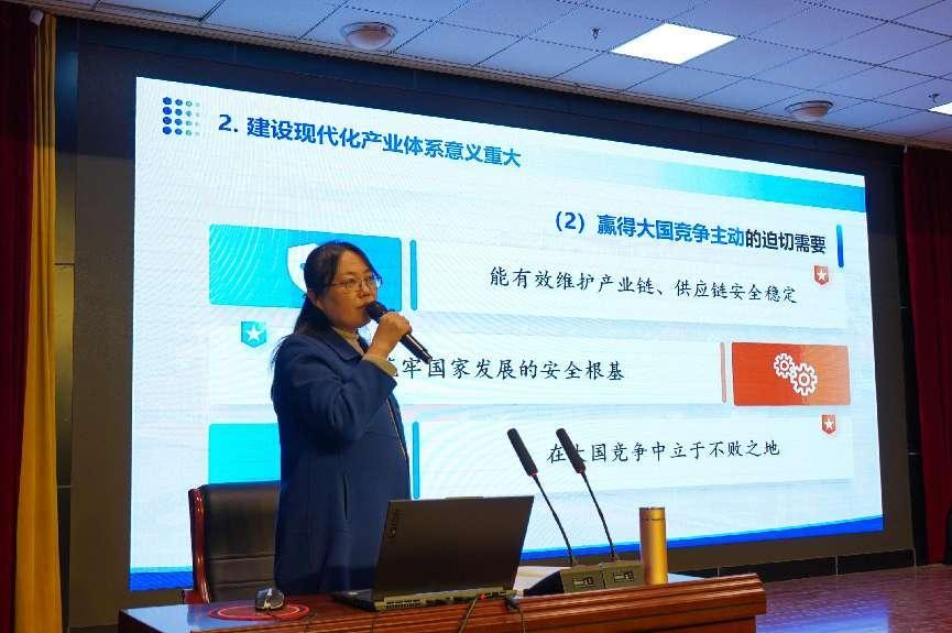 尤彩虹副院长以习近平总书记有关现代化产业体系重要指示精神为指引,从把握现代化产业体系的深刻意蕴、认清产业体系建设的现状与挑战和推进现代化产业体系建设着力点三个方面,运用视频和讲述学生喜闻乐见的案例,深入浅出地向计算机技术系学生讲授了我国现代化产业体系的内涵与外延。