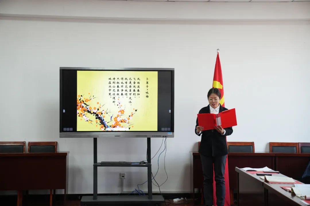 随后,人工智能技术系党支部书记申桂芳等党员代表饱含深情地诵读了《卜算子·咏梅》《七绝改诗赠父亲》《沁园春·长沙》《七律·长征》《沁园春·雪》等经典诗词,一段段精彩的朗读,使大家仿佛置身于革命战争的艰苦岁月,再现了毛泽东和他的战友们走过的那一段波澜壮阔的历史征程,让党员深切感受到了革命胜利的来之不易。