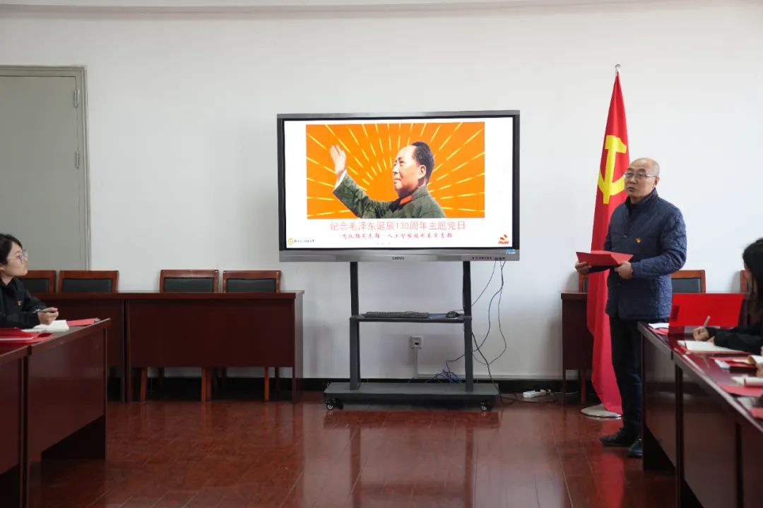 12月26日是中国共产党、中国人民解放军、中华人民共和国的主要缔造者,中国各族人民的伟大领袖毛泽东同志诞辰130周年。为深切缅怀毛泽东同志、铭记毛泽东同志的丰功伟绩和崇高风范,思政部党支部、人工智能技术系党支部在崇德楼1206联合举办“纪念毛泽东诞辰130周年”主题党日活动。活动由思政部党支部书记解晓军主持。