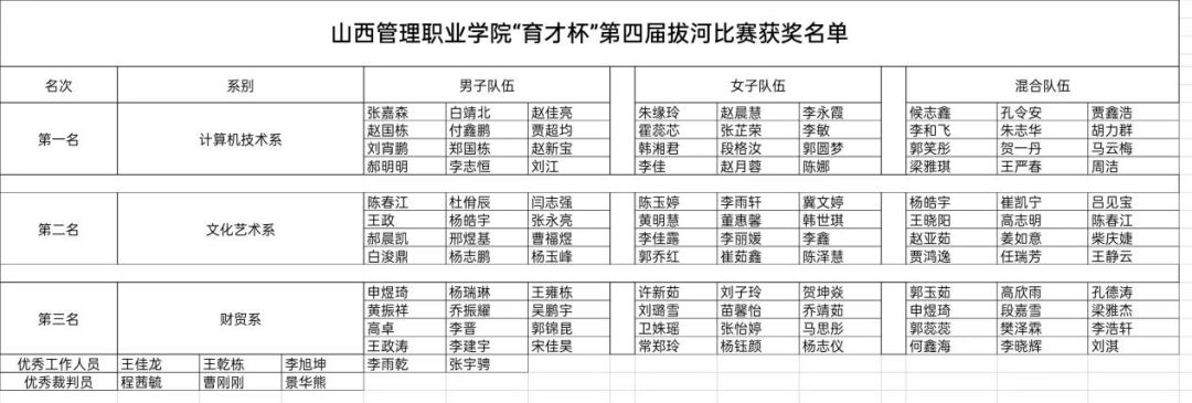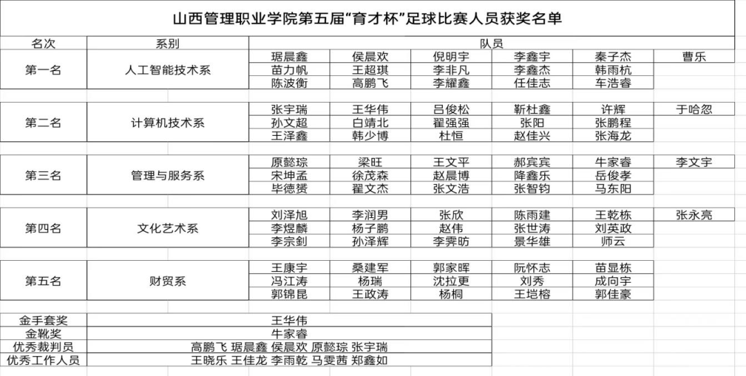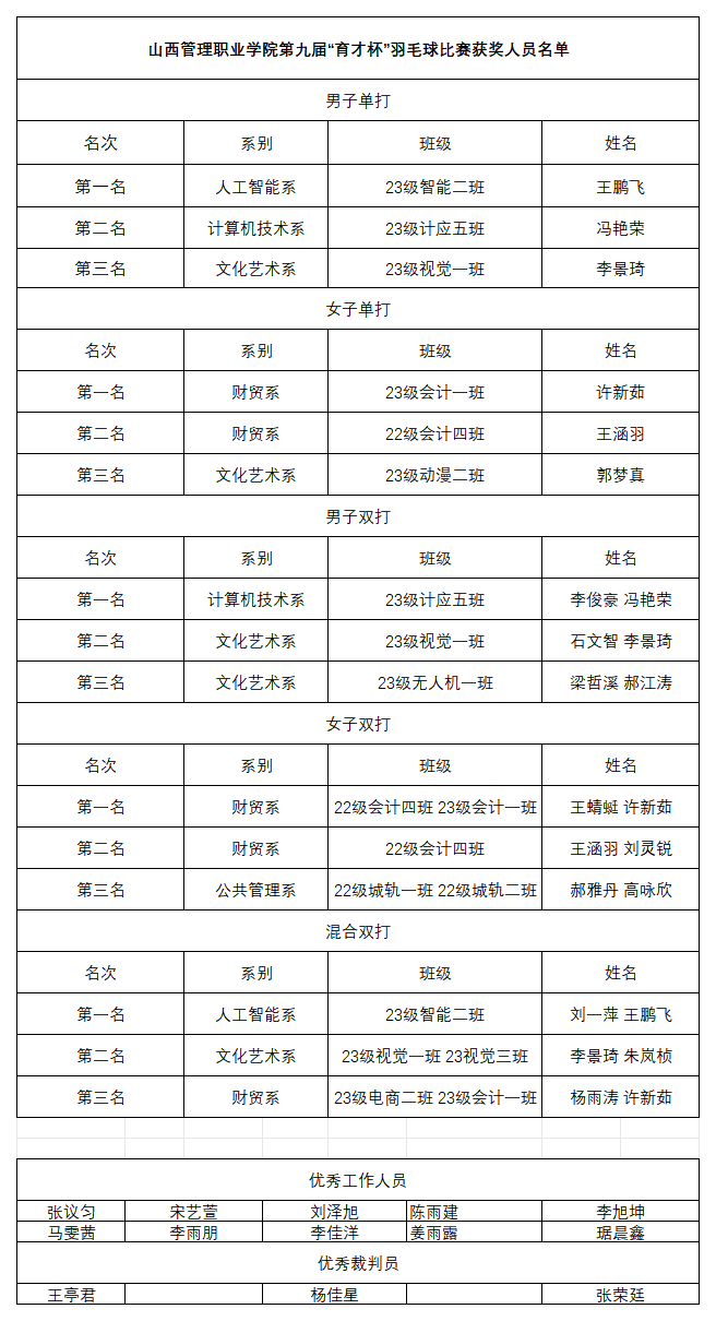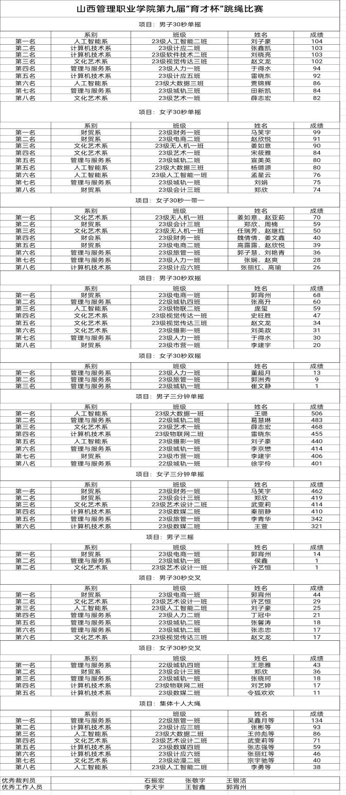本学期“育才杯”院级赛事活动在五个系初赛基础上开赛,在参与人数和影响人数上均有超越,极大地丰富了校园体育文化生活,锻炼了学生的体魄,更为学院参加山西省高职院校体育比赛储备了体育人才,带动了一批体育爱好者,培养了一批不同赛项的裁判员,全面推动了我院体育工作的开展,彰显了我院学生积极乐观,昂扬向上的精神风貌和拼搏进取的体育精神。(附各项比赛成绩及获奖名单)