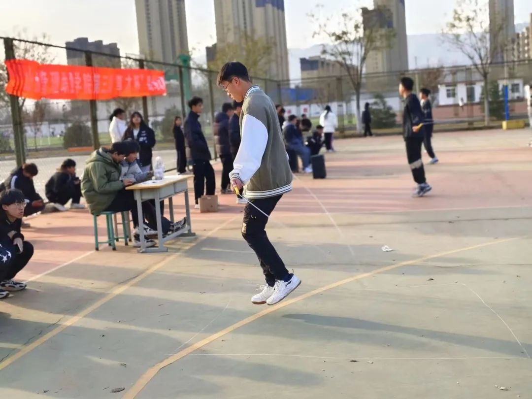 在跳绳比赛中,只见跳绳选手们迅速跃起,如同轻盈的燕子,绳子从他们手中飞速抛出,瞬间划过一道道璀璨的弧线;足球比赛中,选手们始终以饱满的激情,昂扬的斗志,团结向上的精神投入比赛;羽毛球比赛中,选手们打法多变,握紧每一线“胜”机,一记记精彩的扣杀、一次次惊险的扑救,是对速度与技巧的磨砺,也是对心态和体能的考验;在12月的拔河比赛中,选手们汗流浃背,不遗余力,紧紧握住绳索毫不松懈,奋勇拼搏。