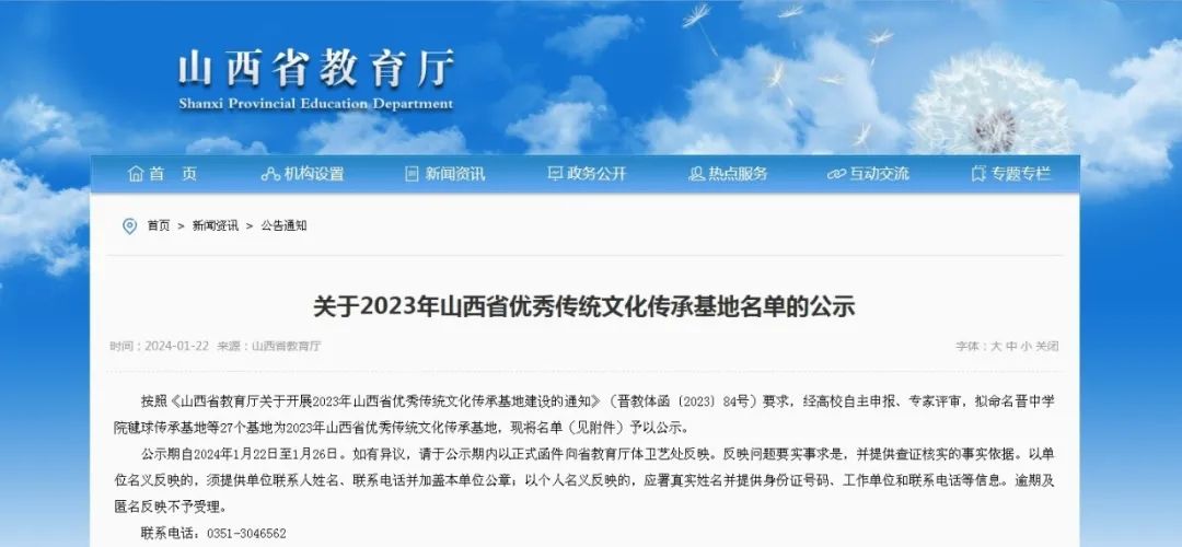 按照《山西省教育厅关于开展2023年山西省优秀传统文化传承基地建设的通知》(晋教体函〔2023〕84号)要求,经高校自主申报、专家评审,拟命名晋中学院毽球传承基地等27个基地为2023年山西省优秀传统文化传承基地,现将名单(见附件)予以公示。