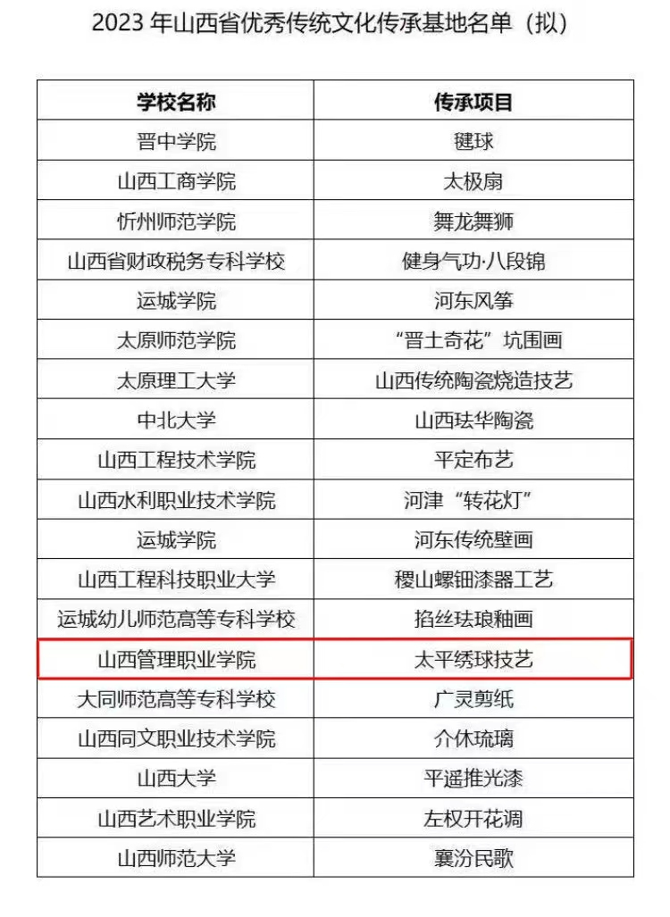 山西省教育厅公示关于2023年山西省优秀传统文化传承基地名单,山西管理职业学院“太平绣球技艺”上榜