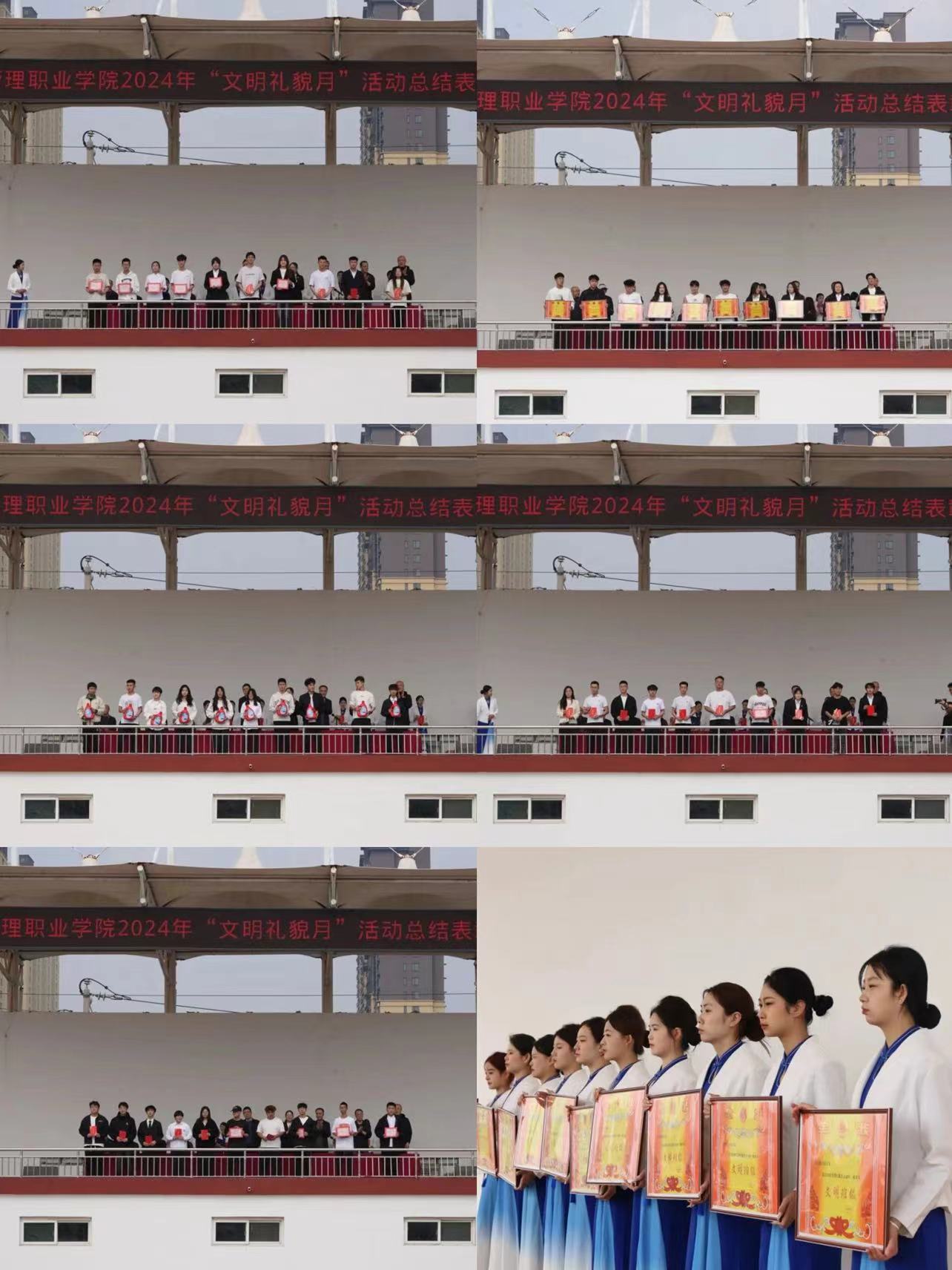 为表彰先进、树立典型,营造积极向上的校园氛围,4月8日上午,我院2024年“文明礼貌月”系列活动总结表彰大会在田径场隆重举行。院党委委员、副院长尤彩虹,院党委委员、宣传统战部部长王玉杰出席大会。会议由学生工作部张俊主持。