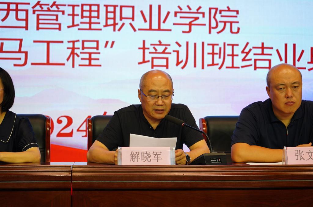 思政部党支部书记、思政部主任解晓军老师作总结讲话。他对第四期“青马班”学员的顺利结业表达了热烈祝贺,对学员们的优秀表现给予充分肯定。同时,对全体青马学员提出殷切期望:做刻苦学习、理论过硬的青年先锋分子;做苦练本领、能力过硬的青年先锋分子;做精神昂扬、作风过硬的青年先锋分子。