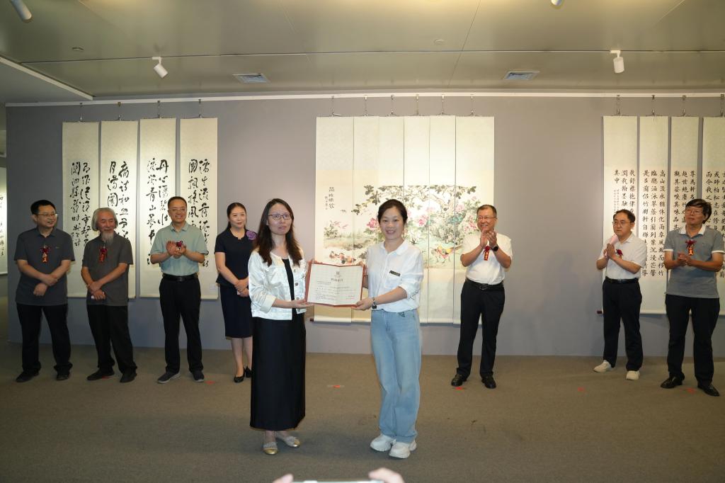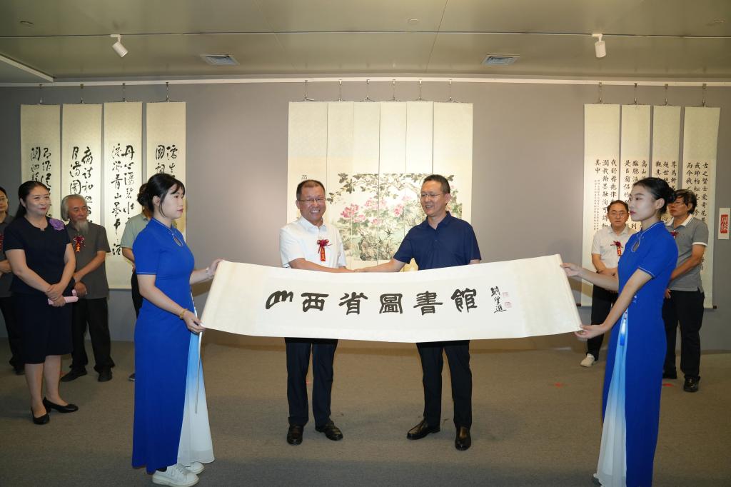 开幕式上,院党委书记韦阳向省图书馆副馆长李建强捐赠省图馆藏作品的裱件,省图书馆副处级干部李静向我院紧缺领域项目负责人岳俊萍颁发收藏证书。