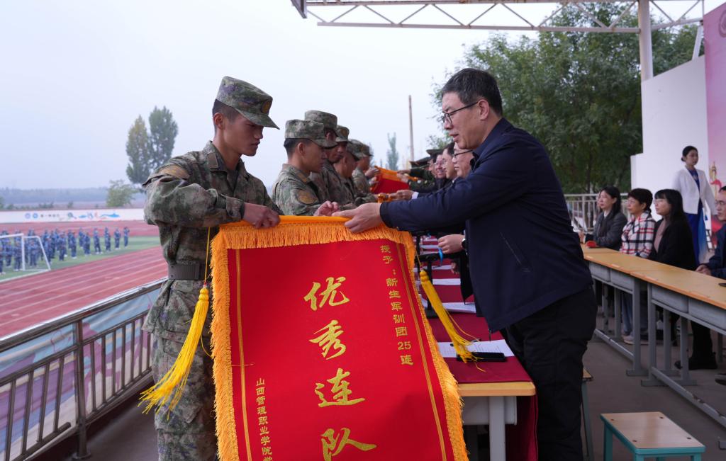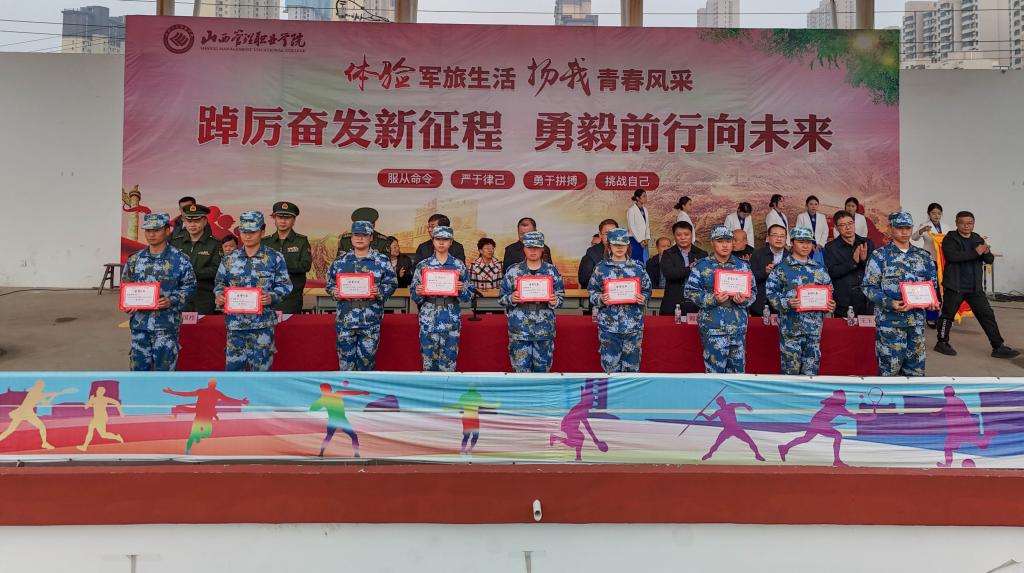 学院党委副书记丁建业宣读《山西管理职业学院关于表彰军训先进集体和优秀个人的通报》,参会领导为受表彰集体和个人颁奖。