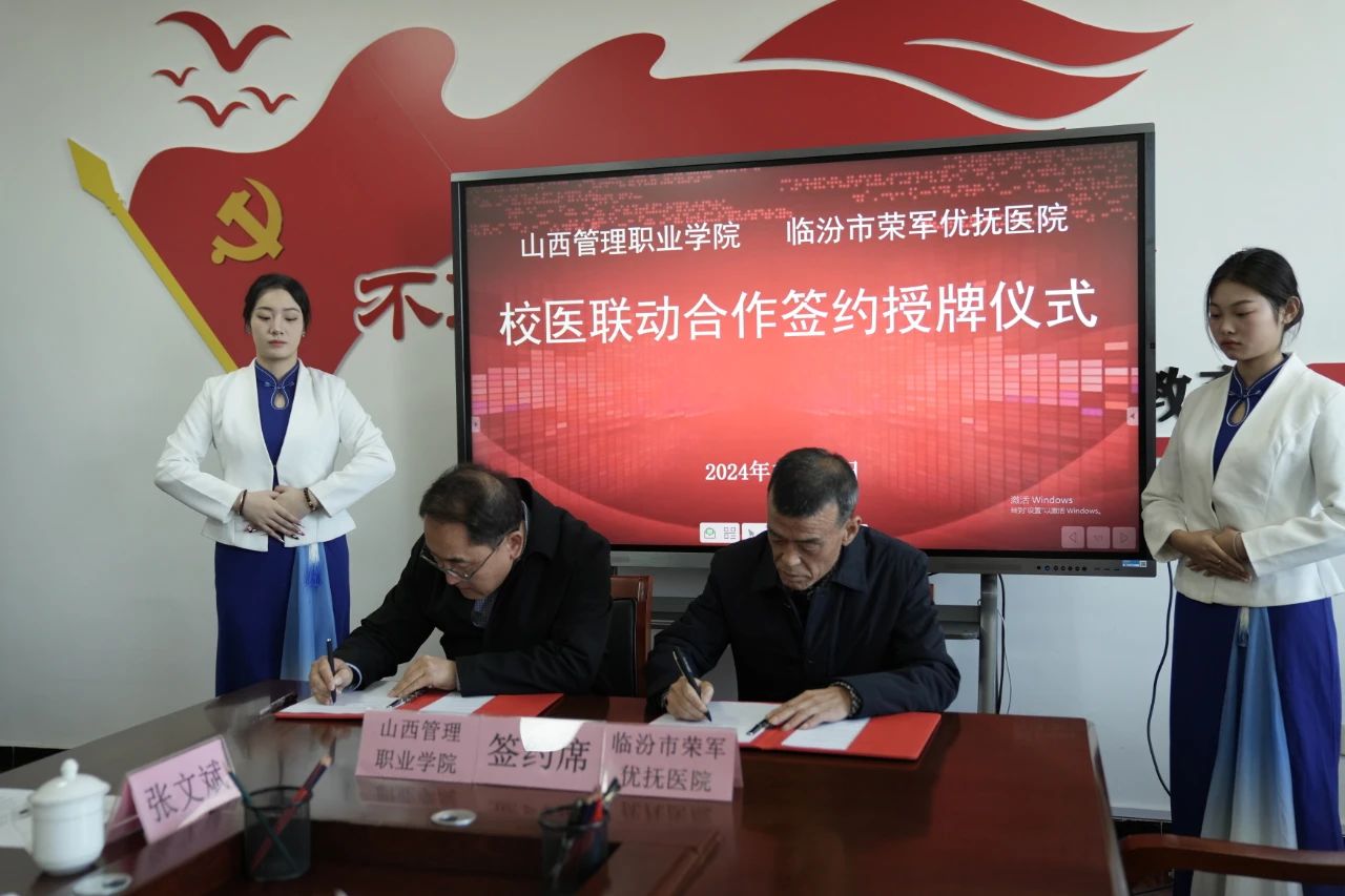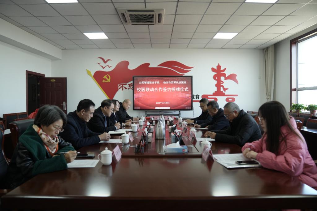 11月28日上午,山西管理职业学院与临汾市荣军优抚医院在崇德楼12层会议室举行大学生心理健康教育“校医联动”合作签约授牌仪式。