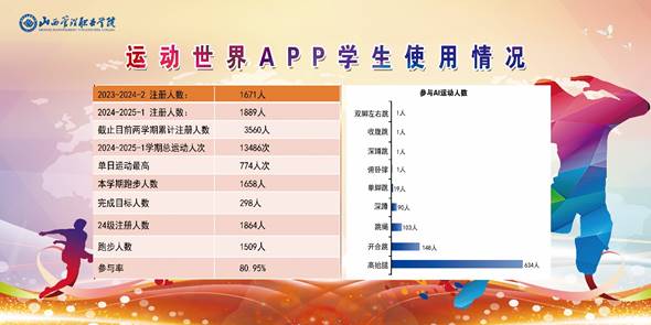 今年适逢新中国成立75周年,我院将课外软件有效应用于体育锻炼之中。借助“运动世界APP”这一课外软件,我们成功开展了以“青年展风采 接力爱国情”为主题的系列庆祝活动,并将其与选修课程紧密挂钩。学生们在参与线上运动时表现出极高的热情,通过APP提供的丰富运动项目,我们进一步实现了让学生远离网络、走出宿舍、走向操场的教育目标。本学期,累计运动人次达13486次;单日运动最高参与人数为774人次。24级学生中,注册人数为1864人,实际参与跑步的有1509人,参与率高达80.95%。