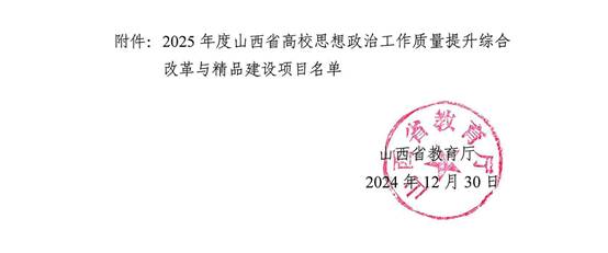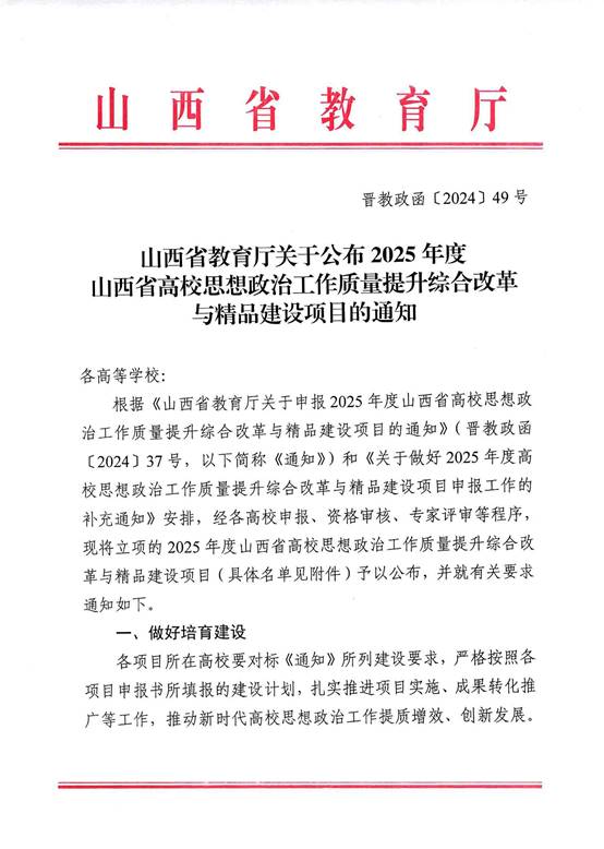 日前,山西省教育厅公布了2025年度山西省高校思想政治工作质量提升综合改革与精品建设项目名单,经各高校申报、资格审核、专家评审等程序,我院组织申报的3个项目获得立项。