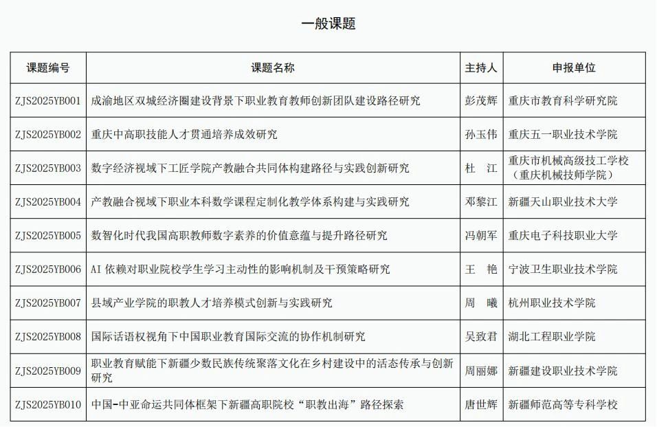 中华职业教育社年度规划课题旨在深入贯彻落实国家关于职业教育的重大决策部署和《教育强国建设规划纲要(2024—2035年)》,推动职业教育理论、政策和应用研究创新。本年度申报竞争异常激烈,全国共申报课题3065项,经省级社资格审查、推荐及总社专家严格评审,最终拟立项课题仅226项(含重大6项、重点86项、一般134项),立项率约7.4%。