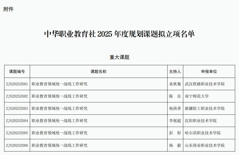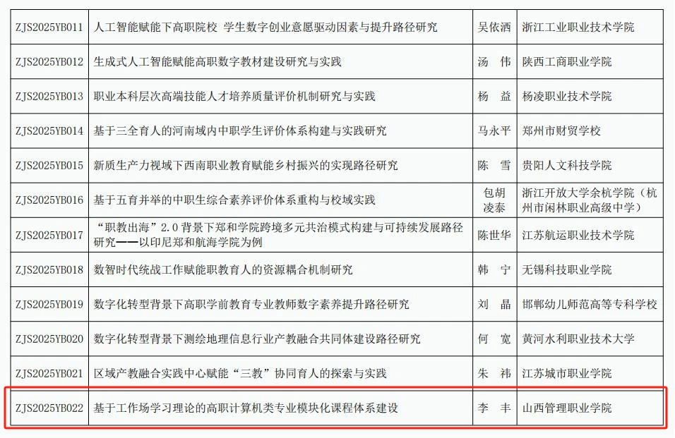 近日,中华职业教育社公示了2025年度规划课题拟立项名单。我院李丰老师团队申报的课题《基于工作场学习理论的高职计算机类专业模块化课程体系建设》成功入选一般规划课题类别。这是我院首次在中华职业教育社年度规划课题中成功立项,标志着学院在国家级职业教育理论研究与政策应用研究领域取得了重要突破。