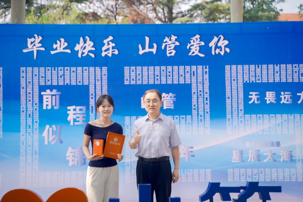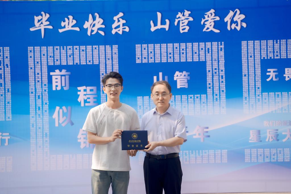 院长王爱国为优秀毕业生颁发证书及学院文创纪念品。