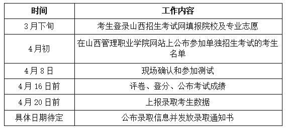 2、现场确认及测试:考生在我院网站下载打印《山西管理职业学院2021年单独招生考生报考登记表(点击下载)》(以下简称《报考登记表》),填好后加盖毕业学校公章。现场确认及测试时间为2021年4月8日,现场确认及测试要求详见我院官网招生就业栏目《山西管理职业学院关于我院2021年单独招生现场确认及测试的通知》。