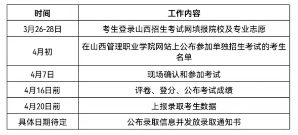 考生在我院网站下载打印《山西管理职业学院2022年单独招生考生报考登记表(点击下载)》(以下简称《报考登记表》),普通高中毕业生必须填写“普通高中学业水平合格性考试成绩(高中会考成绩)”,填好后加盖毕业学校公章。报考信息确认及考试时间为2022年4月7日。