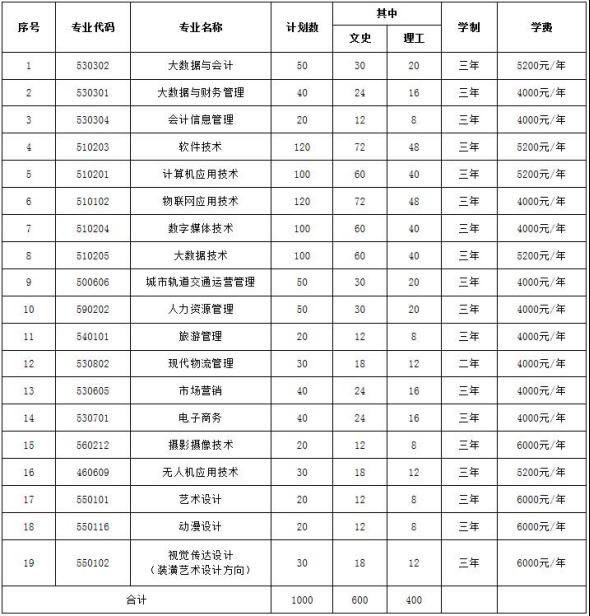 2022年我院在19个专业单独招生,招生计划数合计为1000人。我院严格执行省物价部门批准的收费标准。各专业招生计划、学制、收费标准具体如下: