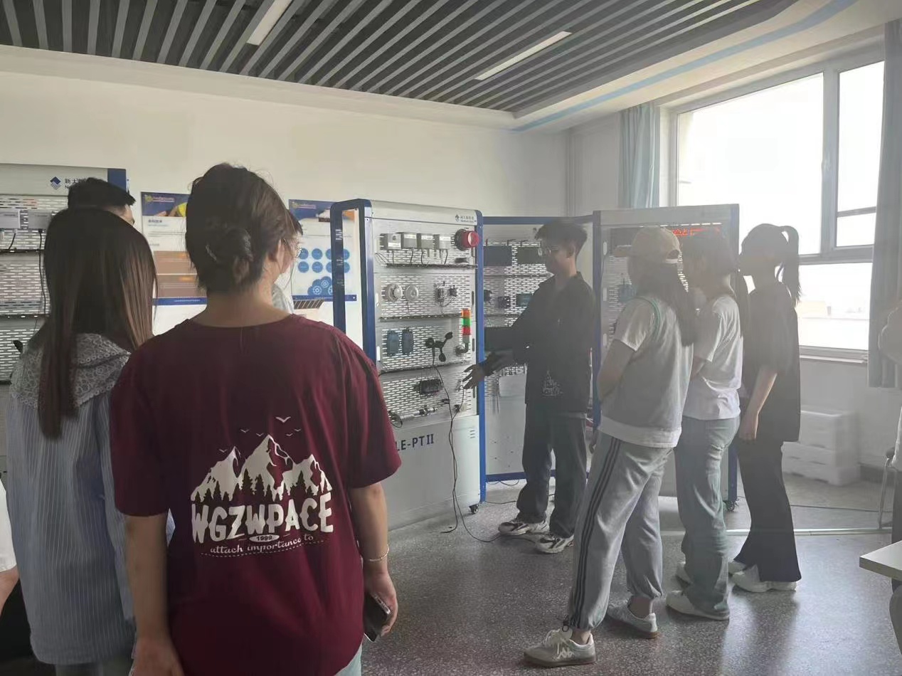 紧接着,学生们来到了物联网工业应用实训室。在这里,23级物联2班学生许浩南同学向大家介绍了物联网技能大赛设备,应用场景包括智能家居、智慧城市、智慧农业等。为了让大家更好地理解物联网的运行逻辑,许浩南还用简单的传感器和通俗易懂的语言解释了物联网的数据传递。这些大赛设备不仅体现了物联网技术的强大功能,也激发了学生们对物联网技术的浓厚兴趣。