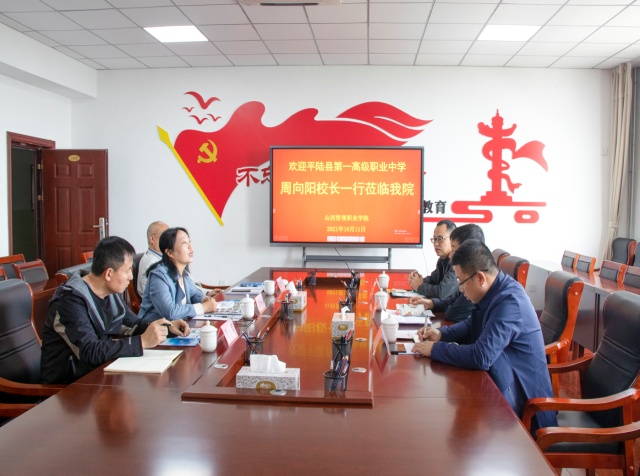 2021年10月11日,平陆县第一高级职业中学校长周向阳、办公室主任武文文、教务处主任郭守军三人赴我院共商巩固拓展职业教育脱贫攻坚成果同乡村振兴有效衔接相关工作,我院副院长尤彩虹、教务处处长张晋江、实训中心主任曹小军参加。