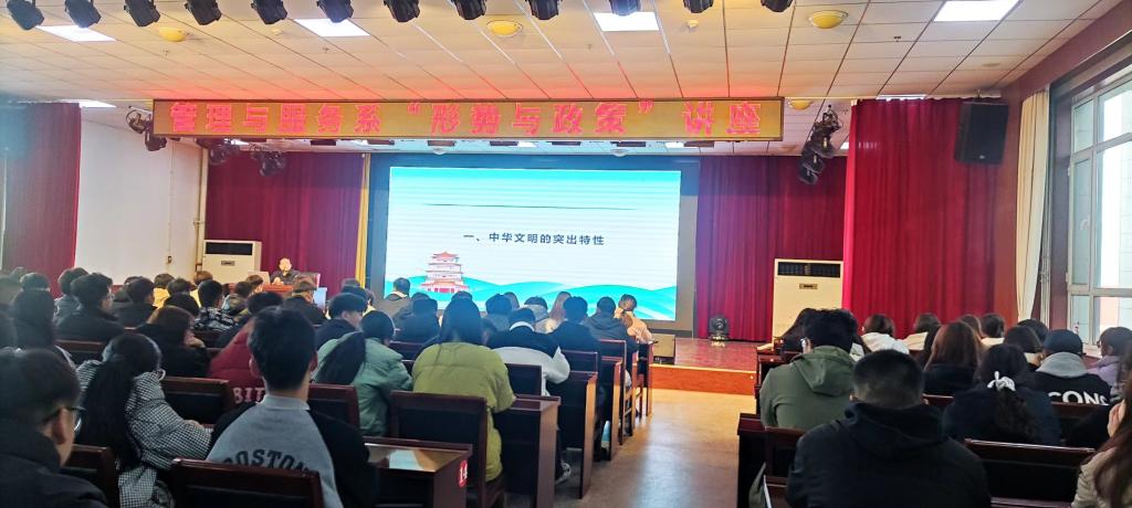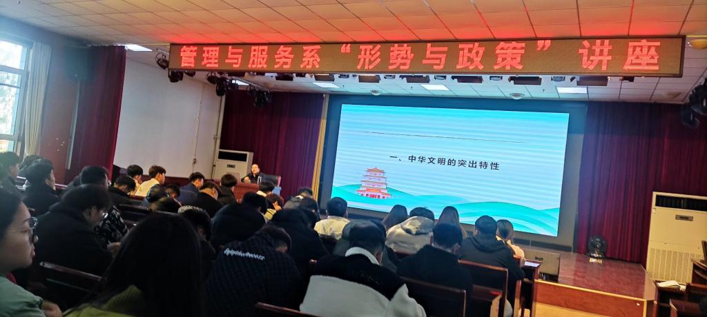 11月28日下午,院党委委员、副院长董刚在崇德楼三楼报告厅,以《新的文化使命谱写中华文明时代华章》为主题为管理与服务系学生作形势与政策专题讲座。