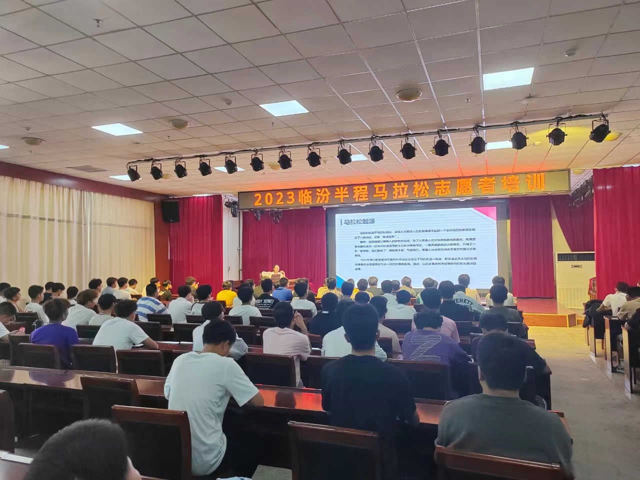 根据组委会前期安排,9月20日,为保障2023临汾半程马拉松赛事顺利进行,赛事运营单位对我院参加赛事志愿服务工作的100名青年学子开展志愿者赛事培训工作,现场模拟演练赛事服务,会后我院青年志愿者有序排队领取物资。