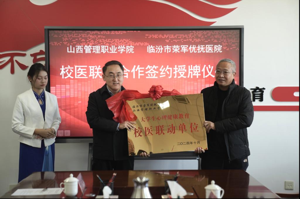 11月28日上午,山西管理职业学院与临汾市荣军优抚医院在崇德楼12层会议室举行大学生心理健康教育“校医联动”合作签约授牌仪式。